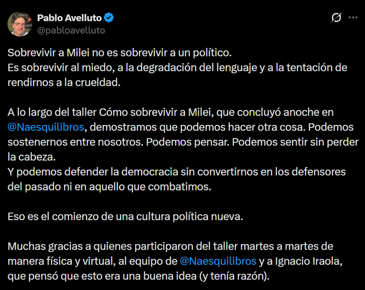 “Sobrevivir a Milei no es sobrevivir a un político”, escribió luego en sus redes. “Es sobrevivir al miedo, a la degradación del lenguaje y a la tentación de rendirnos a la crueldad”.