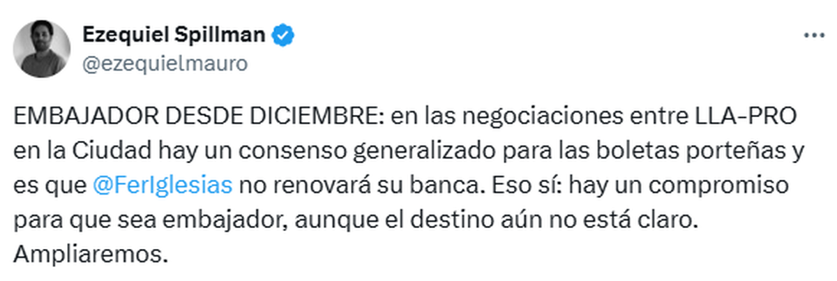 "EMBAJADOR DESDE DICIEMBRE", escribió Spillman. En ese sentido, explicó que en las negociaciones entre LLA y el PRO en la Ciudad de Buenos Aires hay un "consenso generalizado para las boletas porteñas" y agregó que el actual diputado del PRO no renovará su banca, aunque con una condición.