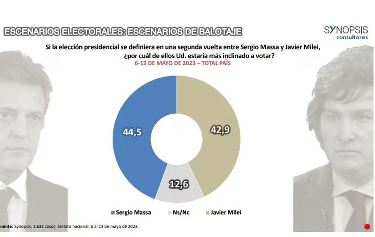 La última encuesta de Synopsis muestra una ventaja ajustada del oficialismo si en el balotaje se midieran Sergio Massa y Milei.