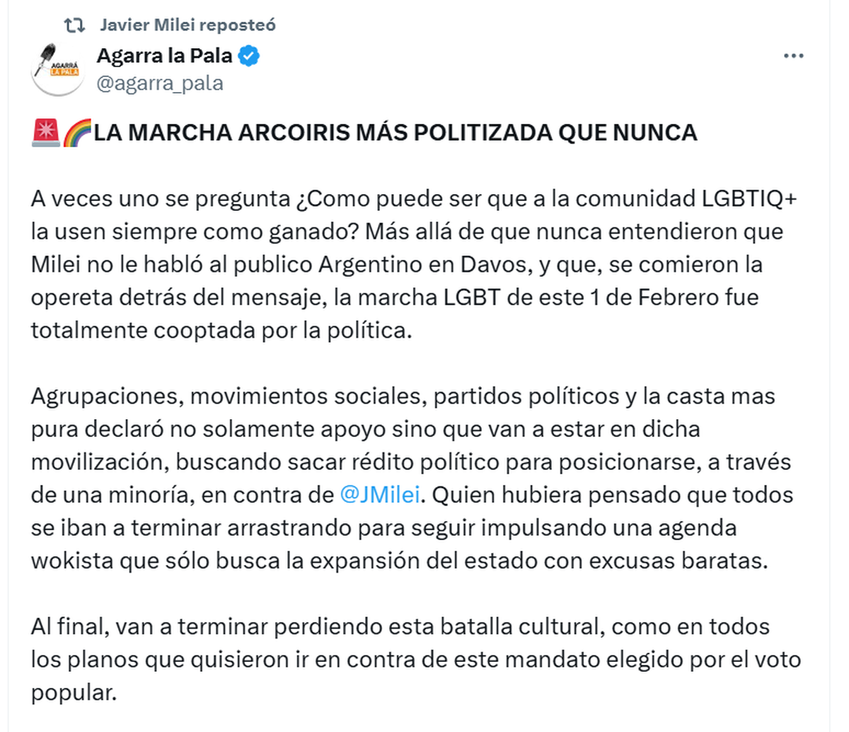 Milei también retuiteó otro mensaje que asegura que la "marcha arcoiris" está "más politizada que nunca", intentando restarle importancia a la protesta del próximo sábado. De todos modos, habría que explicarle al Presidente que toda manifestación es política, en todo caso, habrá querido decir que es partidaria...