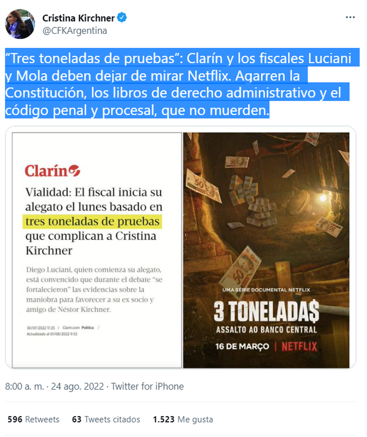 No alcanzó el discurso de una hora y media que dio la vicepresidente Cristina Kirchner ayer (23/08) a través de YouTube. Este miércoles 24 de agosto volvió a su cuenta de Twitter para pegarle a Clarín: