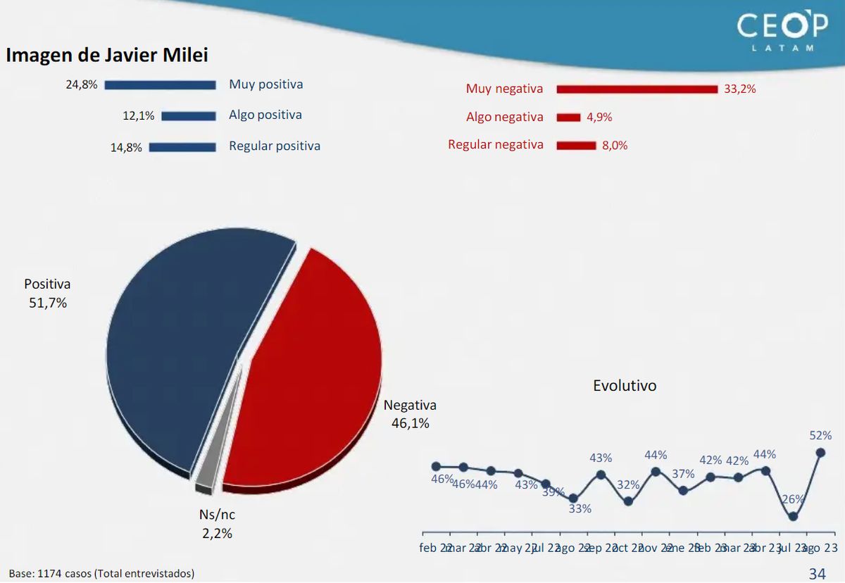 Javier Milei, ganador de las PASO y con quien Massa busca polarizar (y el sentimiento es mutuo), exhibe en cambio un diferencial positivo: 51,7% de aceptación vs. 46,1% de rechazo.