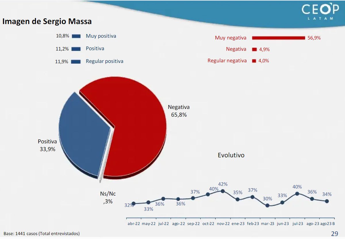 Massa, en tanto, no está en mucho mejores condiciones de acuerdo a la encuesta de CEOP: su imagen positiva cayó 6 puntos desde julio y entre la PASO y la última medición. Su imagen negativa es del 65,8%.