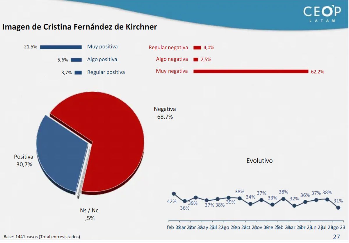 Mientras tanto, se difunde una encuesta que muestra a Cristina Kirchner en un piso histórico de imagen positiva. Se trata de un estudio nacional de CEOP, la firma de Roberto Bacman a la que históricamente se ha vinculado con el kirchnerismo.