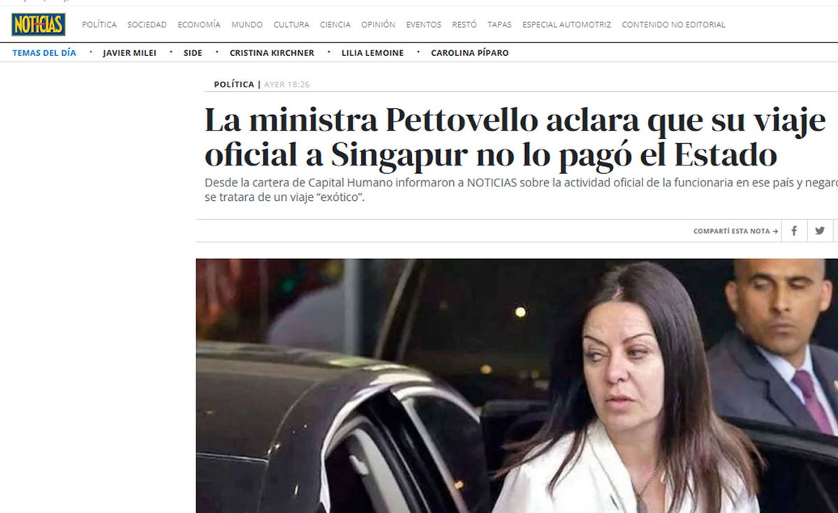 A partir de ello, la revista Noticias publicó un artículo en que hablaba del "exótico viaje" de Pettovello a Singapur, y aludía a que por tratarse de una visita oficial, todos los gastos correrían por cuenta y orden del estado argentino.