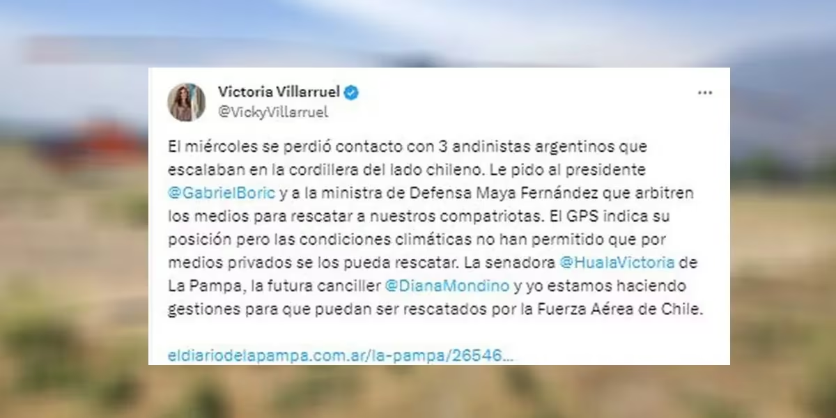 En ese sentido, la vicepresidenta electa Victoria Villarruel a través de X pidió al presidente de Chile, Gabriel Boric y a su ministra de Defensa, Maya Fernández, que colaboren en la búsqueda de los tres andinistas argentinos que se perdieron cuando intentaban ascender desde el lado trasandino, tal como contó U24.