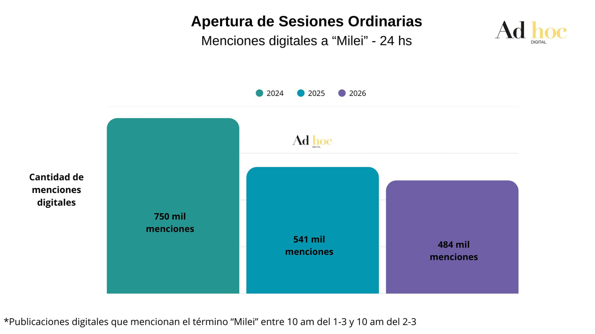 El mismo muestra que en un rango de 24 horas -entre las 10:00 de 01/03 y la misma hora del 02/03- las menciones referidas a la Apertura de Sesiones Ordinarias acumuladas fueron 484 mil, un 10% menos que las 541 mil del año pasado, que a su vez ya habían sido un 28% inferior a las 750 mil de 2024.