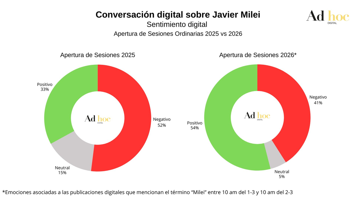 Según el informe de AdHoc, las "emociones" asociadas a las publicaciones que mencionan el término "Milei" fueron positivas en el 52% de la conversación total, contra el 41% que fueron negativas.