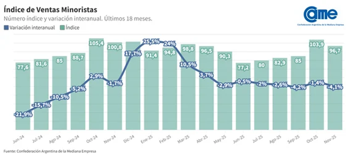 Según informaron desde la Cámara de la Mediana Empresa, (Came), en noviembre registraron un desplome del 9,1% en relación a octubre y un 4,1% en comparación al mismo período del 2024.