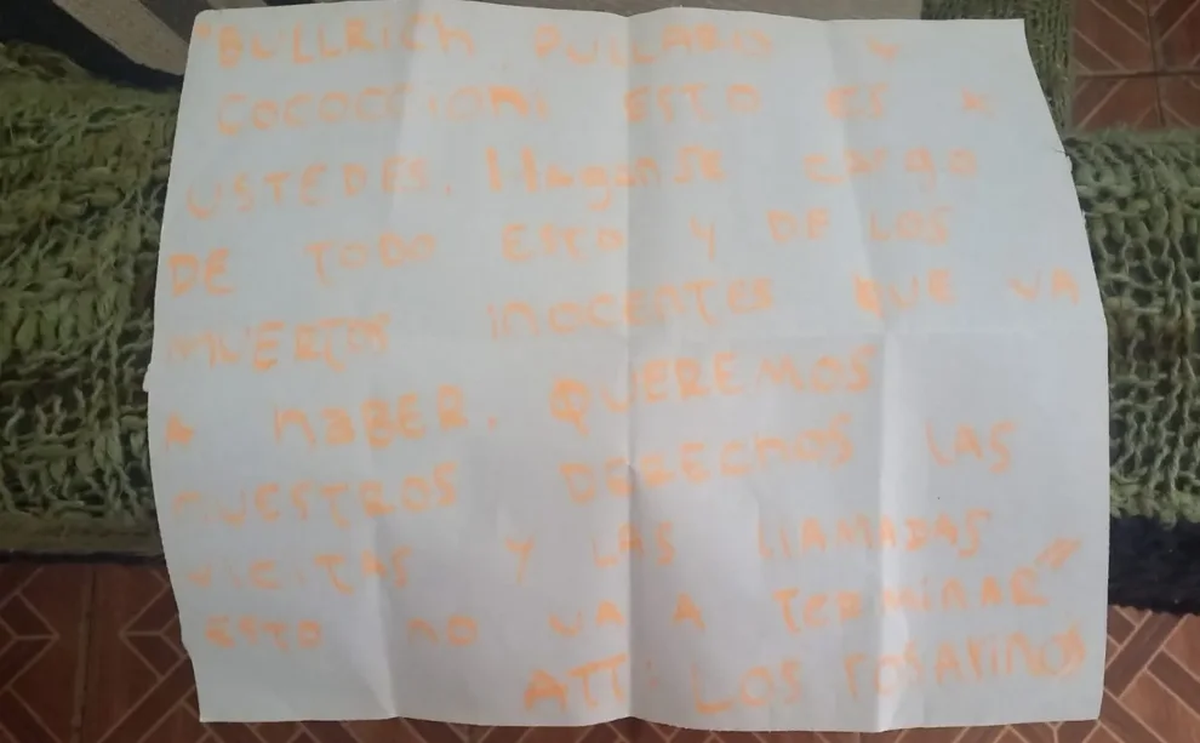 A partir de informes policiales, en uno de los incidentes se encontró una nota amenazante dirigida a parte de los responsables de las políticas carcelarias a nivel nacional y provincial: los ministros de Seguridad, Patricia Bullrich y Pablo Cococcioni. Pullaro no quedó atrás.