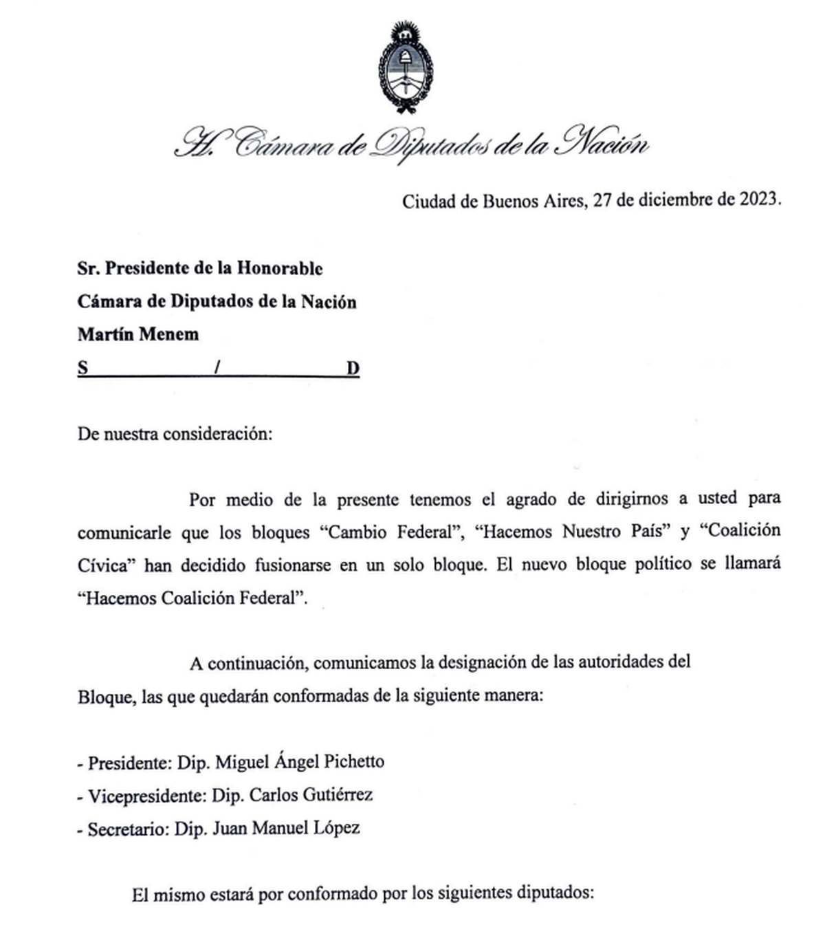 Además de Pichetto, Gutiérrez y López, el bloque Hacemos Coalición Federal está conformado por los legisladores: