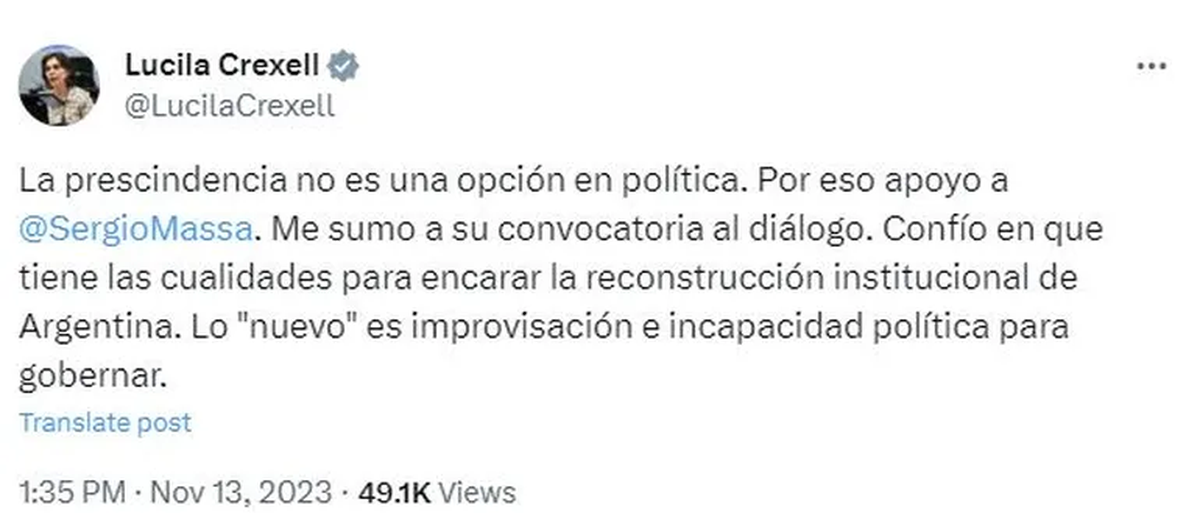 “La prescindencia no es una opción en política. Por eso apoyo a Sergio Massa. Me sumo a su convocatoria al diálogo. Confío en que tiene las cualidades para encarar la reconstrucción institucional de Argentina. Lo ‘nuevo’ es improvisación e incapacidad política para gobernar”, dijo Lucila Crexell a través de su cuenta de la red social X, ex Twitter con una alusión a la ‘prescindencia’ que optaron por seguir los partidos integrantes de JxC ante el balotaje, lo que mantuvo unido a la bancada tras el pacto de Milei con Macri.