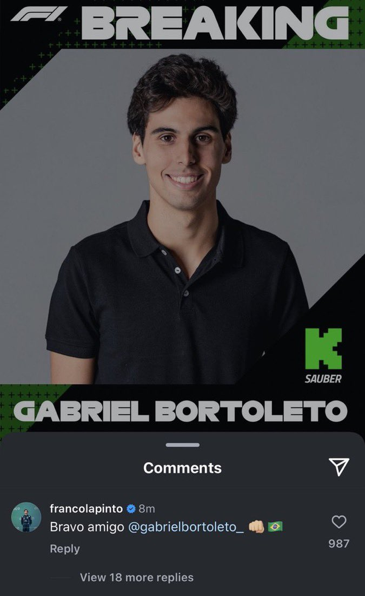 La escudería Kick Sauber, que pronto pasará a ser parte de Audi, renovará su alineación de pilotos con la salida de Valtteri Bottas y Guanyu Zhou, quienes no continuarán el año próximo. En tanto, Bortoleto, formará una nueva dupla con el experimentado Hulkenberg, quien fue confirmado previamente. "Bravo amigo", fue el mensaje que Franco hizo público para el brasileño.