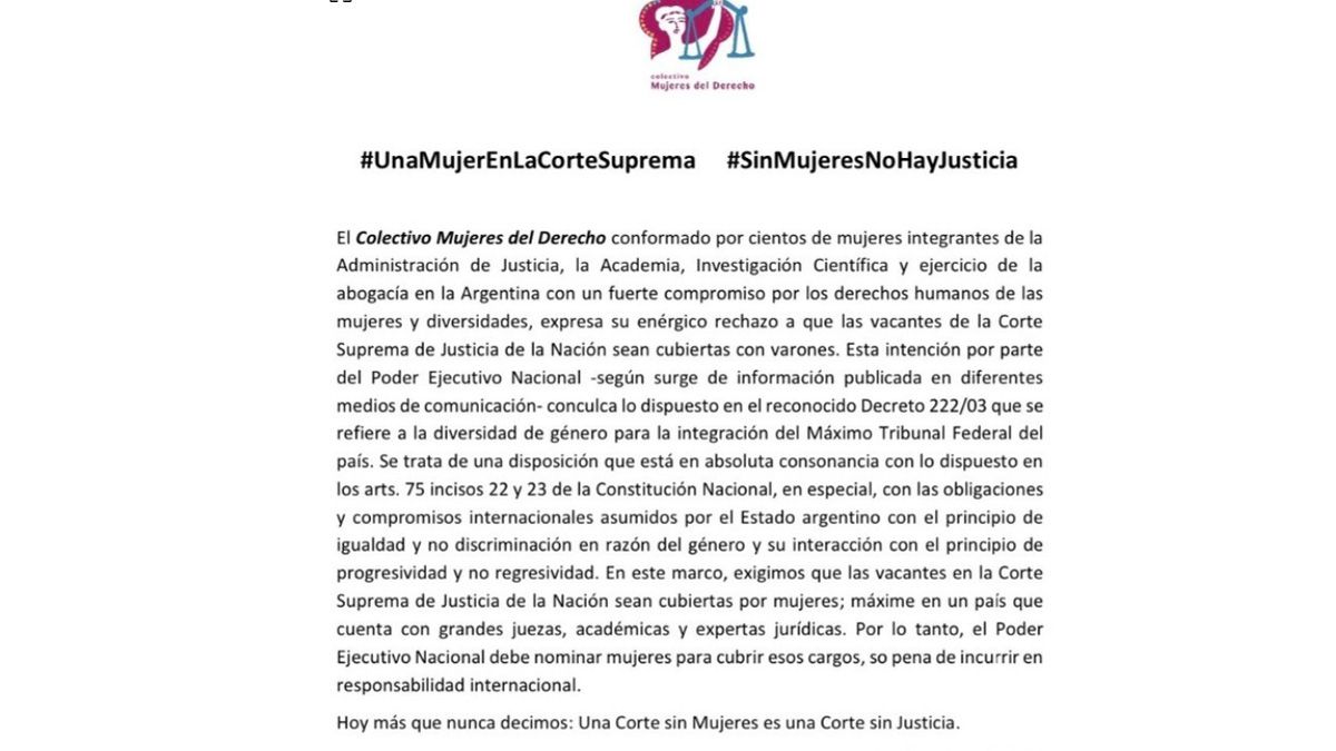 "El Colectivo Mujeres del Derecho conformado por cientos de mujeres integrantes de la Administración de Justicia, la Academia, Investigación Científica y ejercicio de la abogacía en la Argentina con un fuerte compromiso por los derechos humanos de las mujeres y diversidades, expresa su enérgico rechazo a que las vacantes de la Corte Suprema de Justicia de la Nación sean cubiertas con varones", sostuvieron.