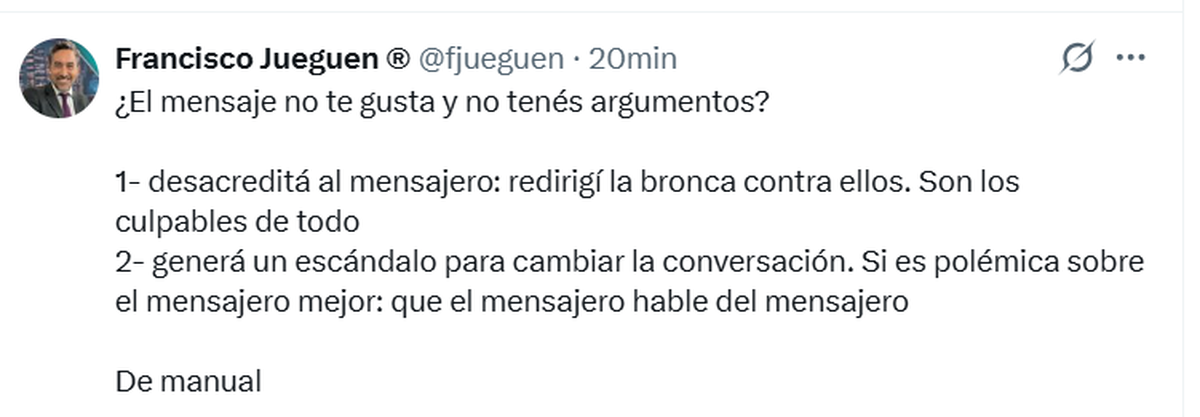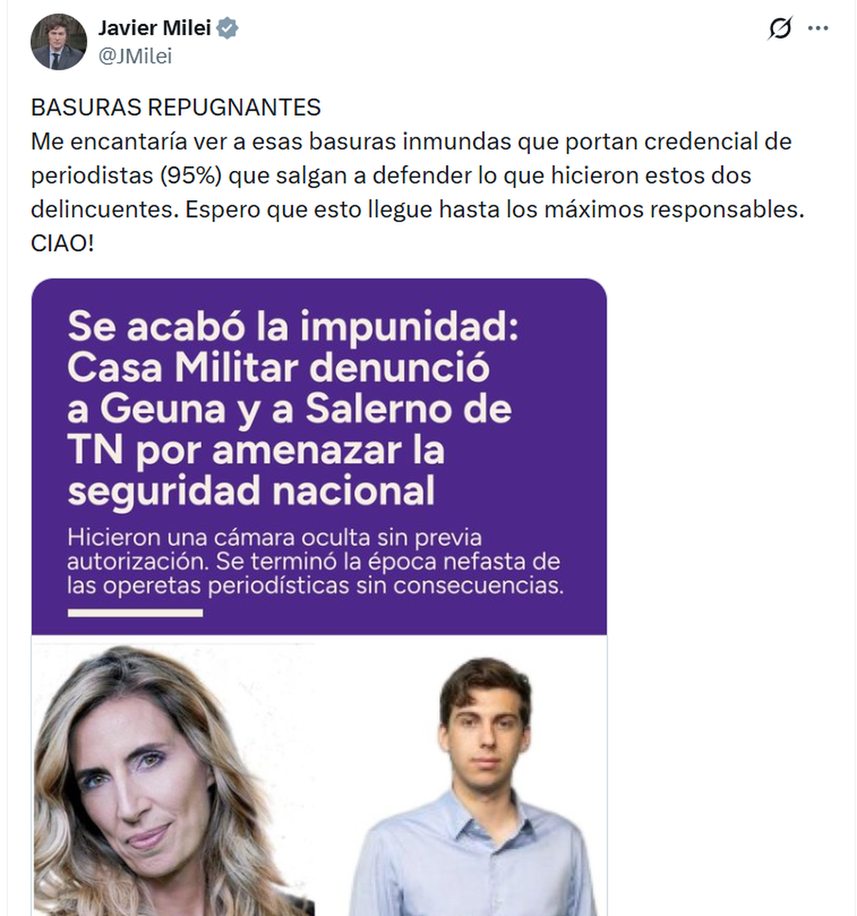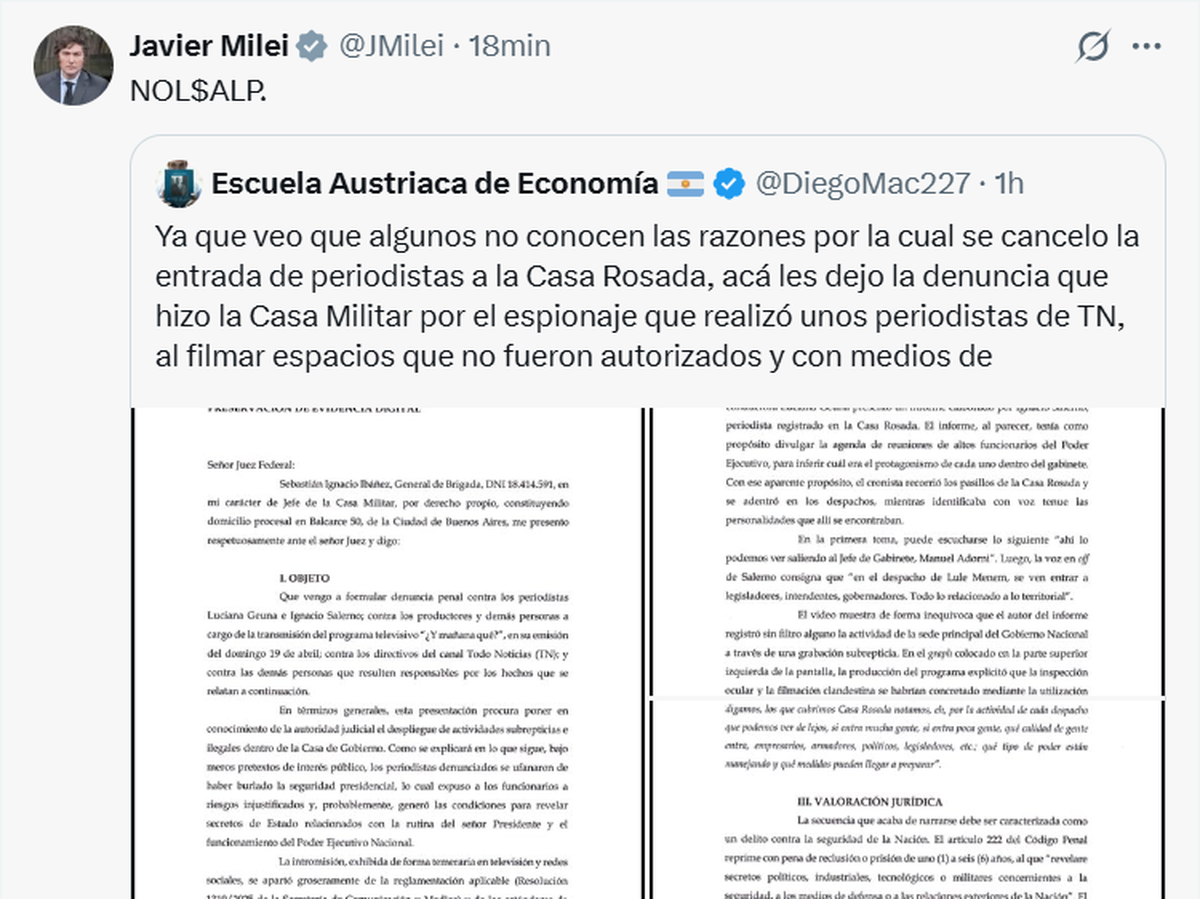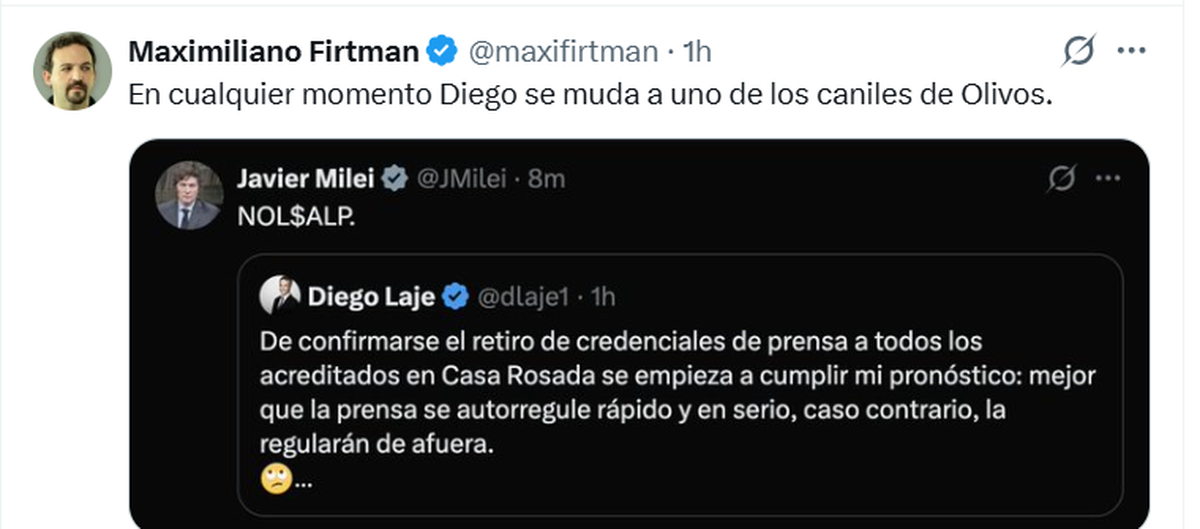 Luego, el mandatario compartió muchos posteos en X haciéndose eco de esta situación e insultando a la prensa, una vez más, y justificando su decisión. No escatimó agravios hacia Luciana Geuna.