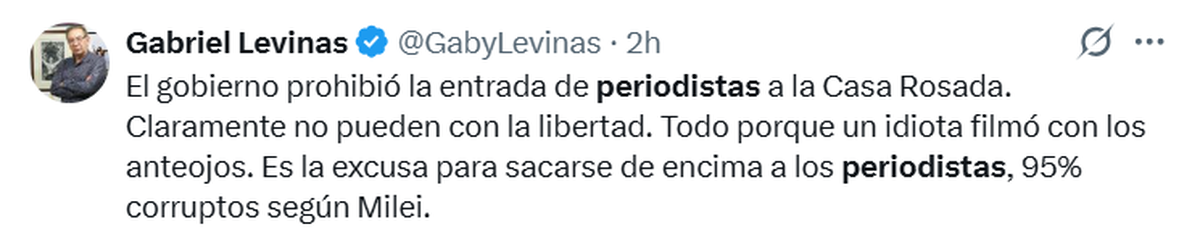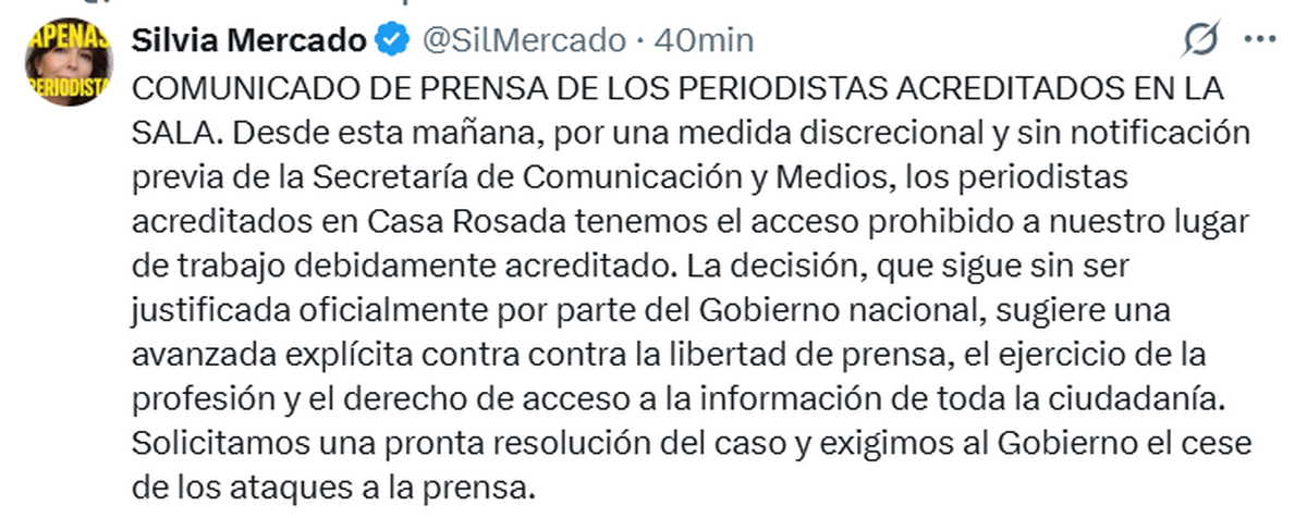 Y agregó: "La Casa Rosada no es propiedad privada y mucho menos un mandatario ni sus funcionarios esbirros pueden decidir si a dicho edificio puede acceder la prensa".