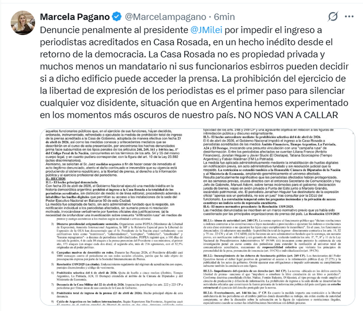 "Denuncié penalmente al presidente Javier Milei por impedir el ingreso a periodistas acreditados en Casa Rosada, en un hecho inédito desde el retorno de la democracia", informó Pagano en su cuenta de X.