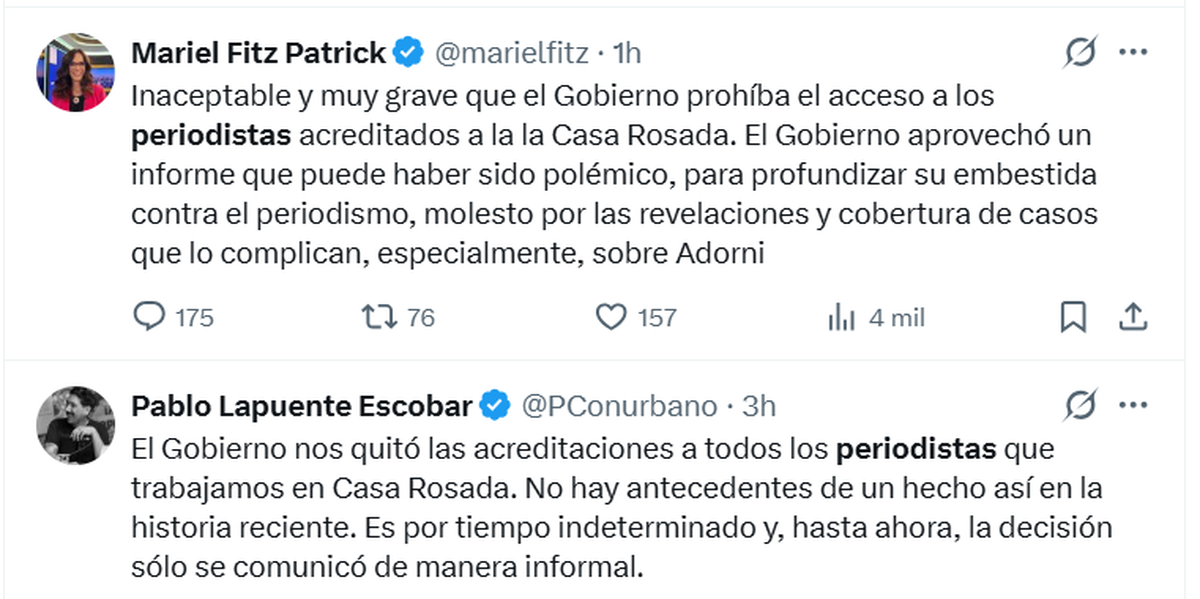 "El gobierno CERRÓ LA SALA DE PERIODISTAS de la Casa Rosada. Decidió no renovar las acreditaciones de todos los periodistas por la denuncia de Casa Militar a raíz de la filmación efectuada por el programa de Luciana Geuna. No se sabe hasta cuándo", advirtió en su cuenta de X la periodista Liliana Franco.