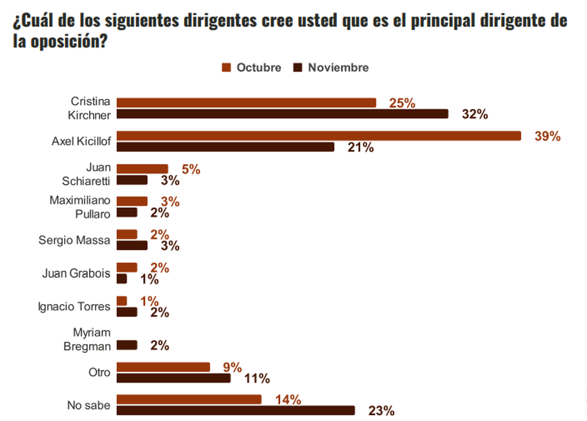 A pesar del rechazo a los opositores, Cristina Kirchner sigue siendo vista como la principal referente de la oposición, superando en noviembre a Axel Kicillof que había liderado el espacio por la visibilidades que le dio la victoria electoral de septiembre.