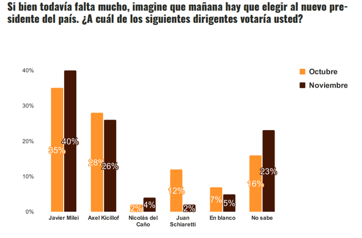 Por último, con miras a las presidenciales de 2027 y aclarado que aún resta mucho para esos comicios, Javier Milei aparece como el gran favorito con el 40% de intención de voto contra el 26% de Axel Kicillof.
