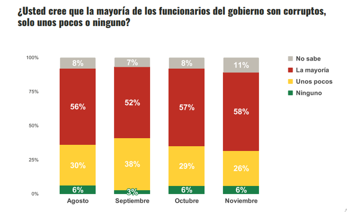Más llamativo aún es que 58% de los consultados creen que la mayoría de los integrantes del gobierno nacional son corruptos.