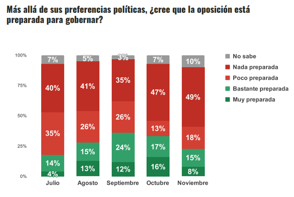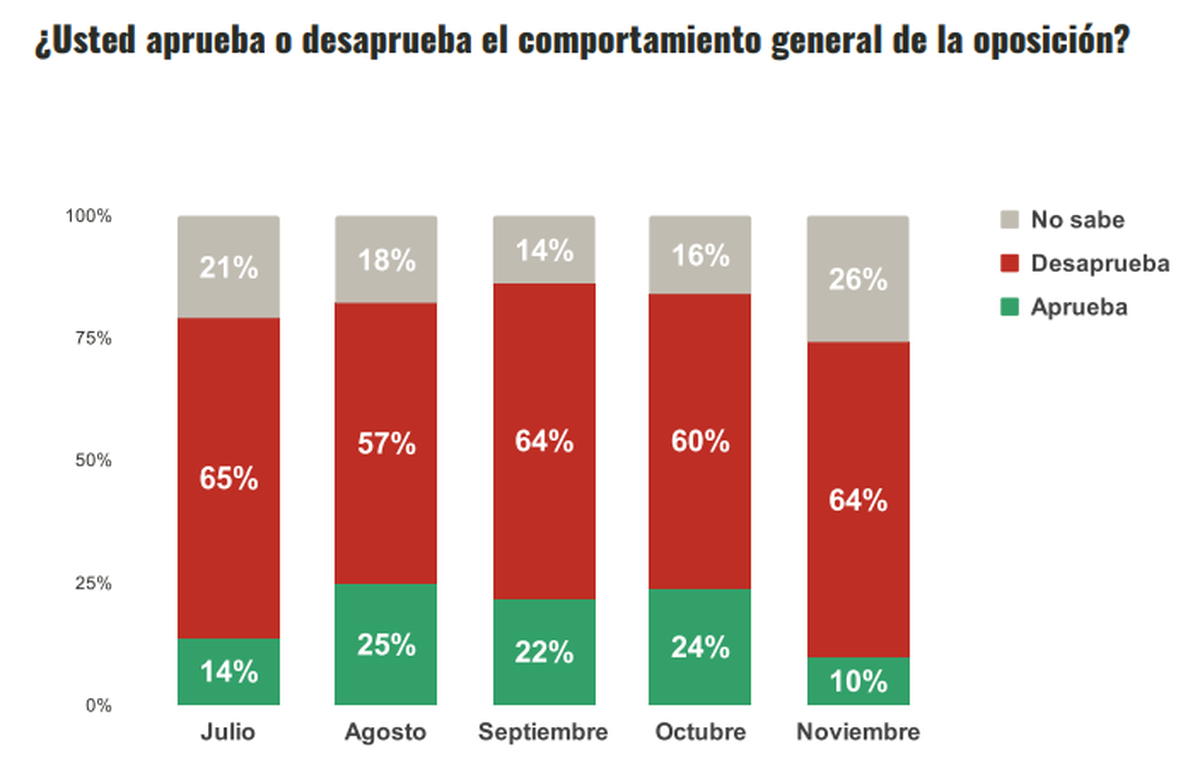 Contrariamente a lo que ocurre con los números de Milei, que mejoraron de octubre a noviembre, en el caso de la oposición empeoraron.