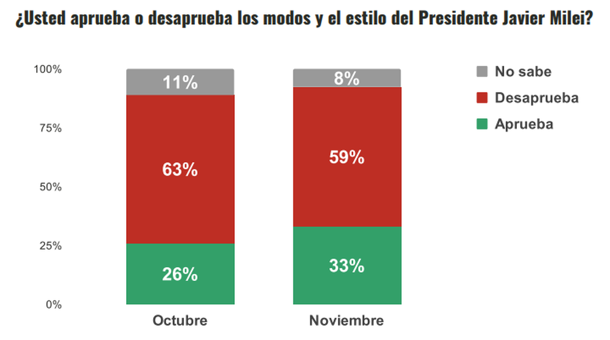 Los "modos" y estilo de conducta de Milei tampoco tienen apoyo de la mayoría, que lo desaprueba, pero como en otras preguntas, los resultados mejoran con respecto a octubre.