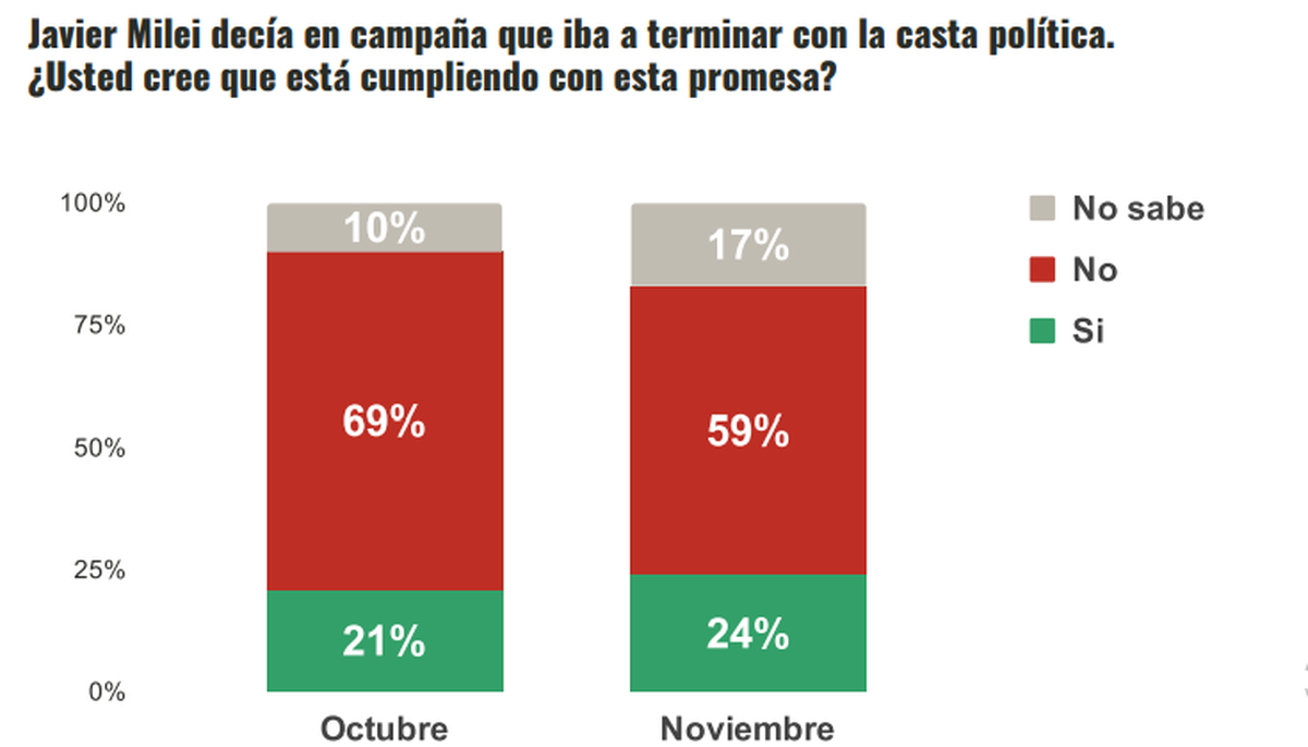 Tampoco cree la mayoría que Milei esté cumpliendo con su promesa de campaña de ir contra la "casta" política. Casi un 60% respondió que "no" con un 24% que cree lo contrario, evidenciando una leve mejora intermensual.