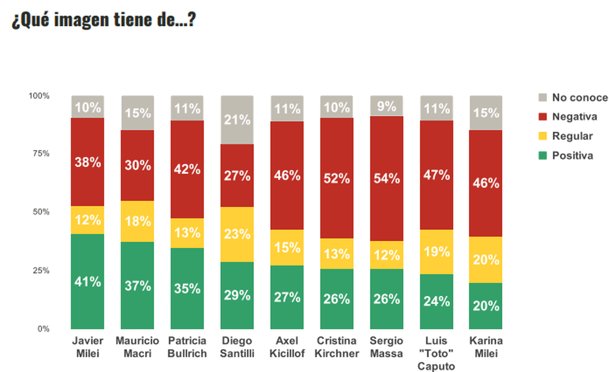 Como planteamos antes, a pesar de los cuestionamientos a su gobierno, la economía y su estilo, Javier Milei aparece como el dirigente con mejor ponderación por parte de la sociedad con el 41%, dejando a Mauricio Macri en segundo lugar con el 37% y tercera a Patricia Bullrich con el 35%.