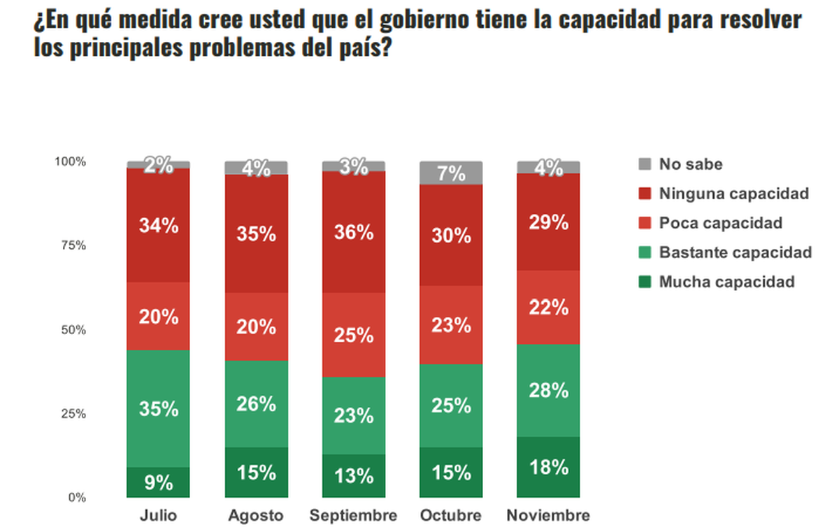 Llamativamente, a pesar del empate en cuanto a la ponderación de la gestión de Milei, un 51% cree que su Gobierno tiene nula o poca capacidad para resolver los principales problemas del país.
