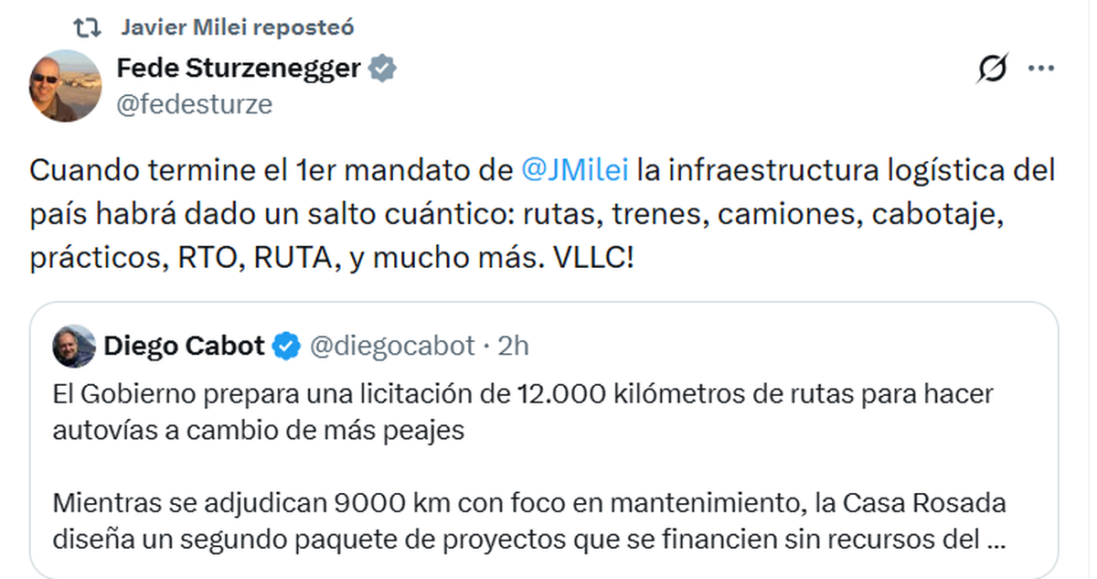 "Cuando termine el 1er mandato de Javier Milei la infraestructura logística del país habrá dado un salto cuántico: rutas, trenes, camiones, cabotaje, prácticos, RTO, RUTA, y mucho más", dice el mensaje en tono de promesa del funcionario, retuiteado por el Presidente.