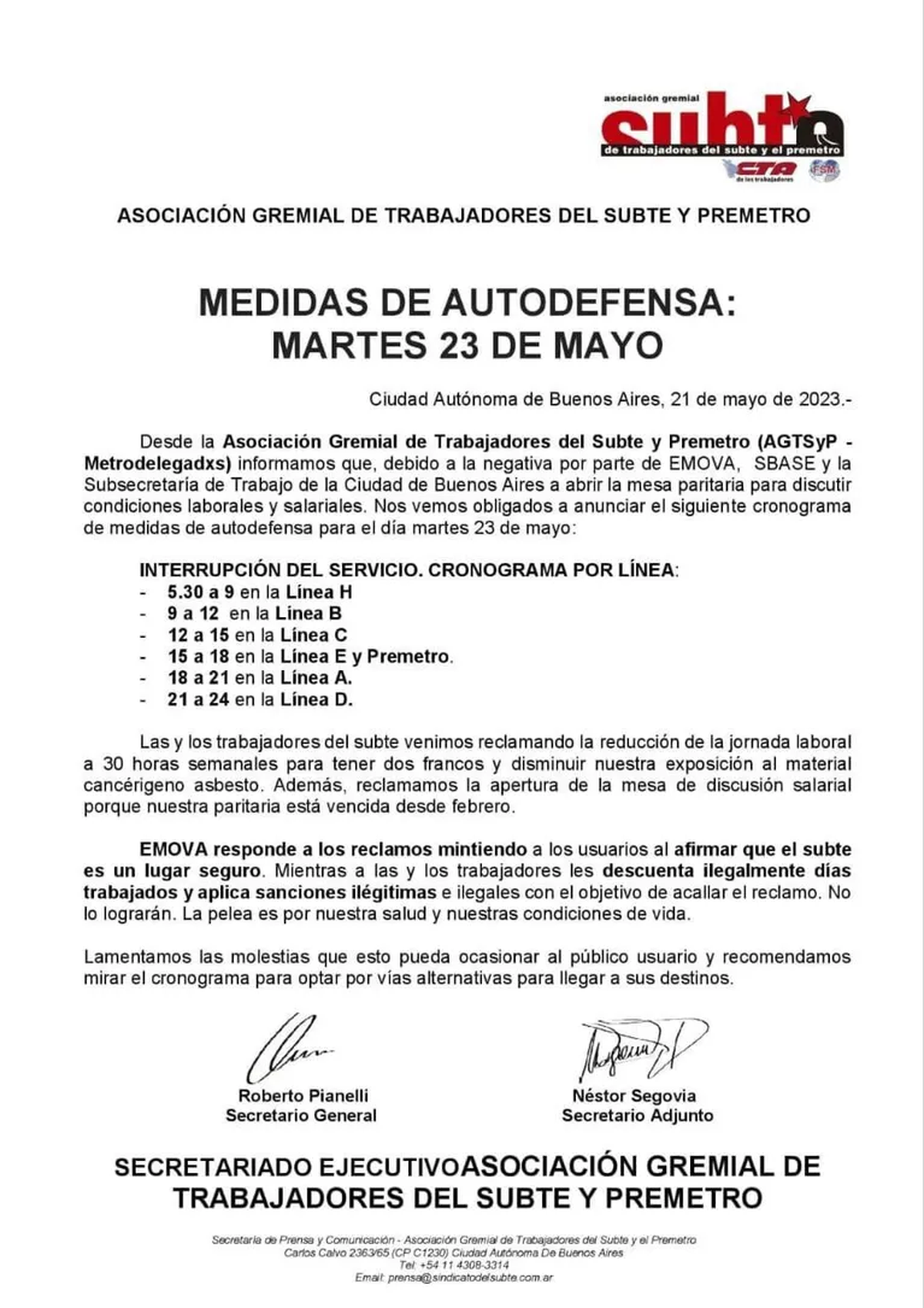 “Los metrodelegados informamos que, debido a la negativa por parte de EMOVA, SBASE y la Subsecretaría de Trabajo de la Ciudad de Buenos Aires a abrir la mesa paritaria para discutir condiciones laborales y salariales. Nos vemos obligados a anunciar el siguiente cronograma de medidas de autodefensa para el día martes 23 de mayo”, informaban a través de un comunicado.