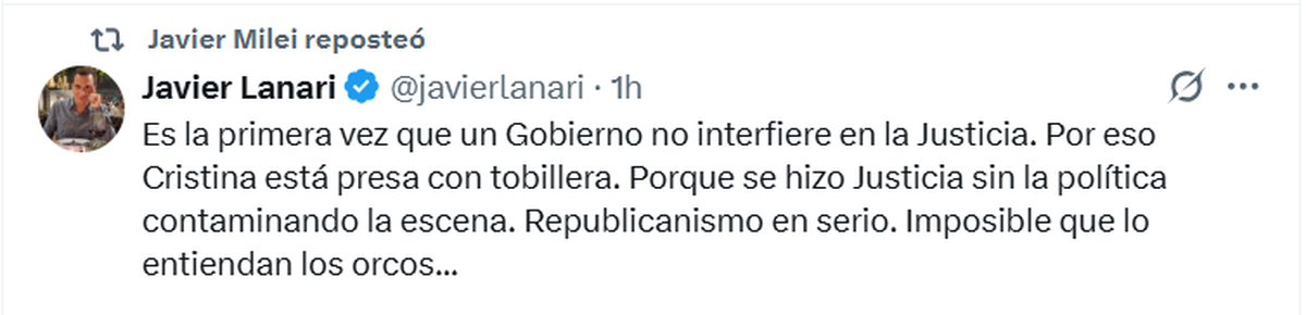 Ante el revuelo que se generó, y la denuncia penal, Milei salió aclarar en X su polémica frase, vía Javier Lanari -subsecretario de Prensa de la Nación-: "Es la primera vez que un Gobierno no interfiere en la Justicia. Por eso Cristina está presa con tobillera. Porque se hizo Justicia sin la política contaminando la escena. Republicanismo en serio. Imposible que lo entiendan los orcos...", escribió el funcionario y fue retuiteado por el Presidente en X: