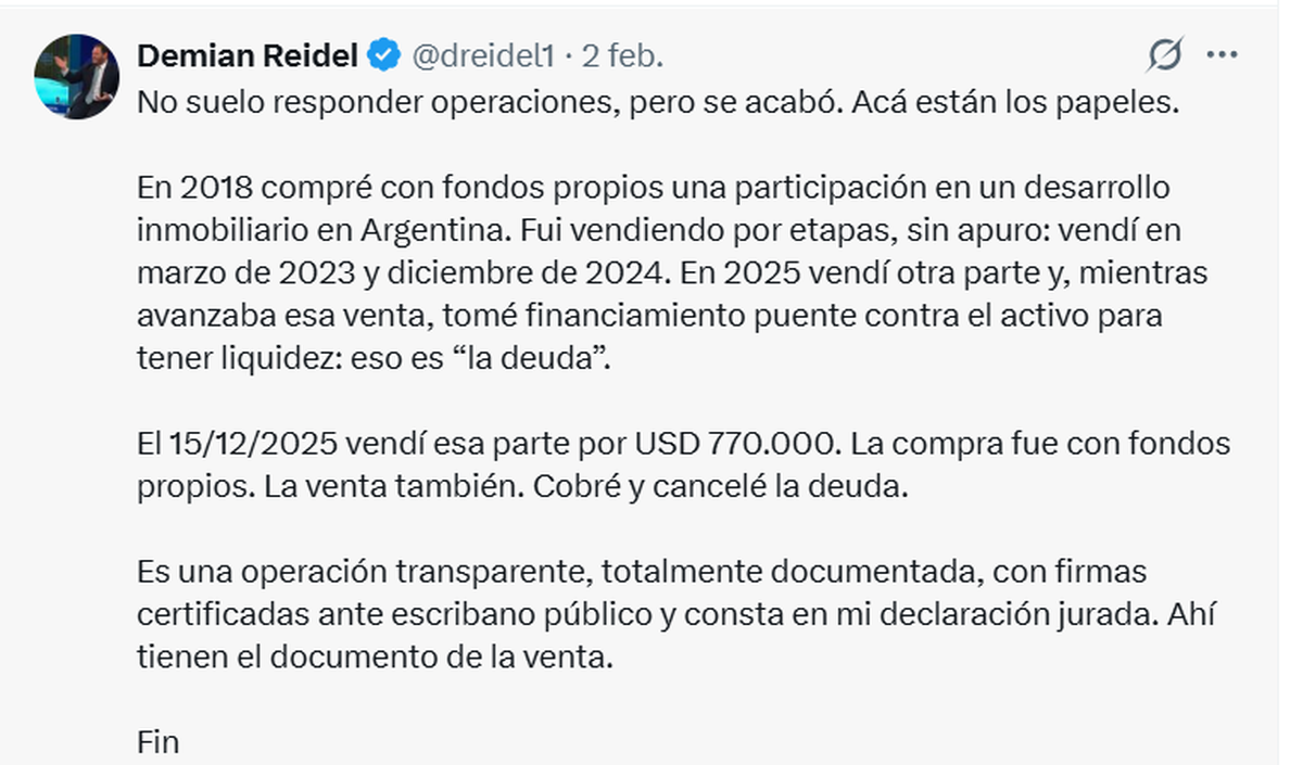 Tras estallar esa polémica, el funcionario contó que había saldado las deudas. Sorprendió que haya cancelado semejante monto de dinero en tan sólo 18 días: Demian Reidel explicó que lo hizo porque vendió su parte de "una participación en un desarrollo inmobiliario en Argentina".