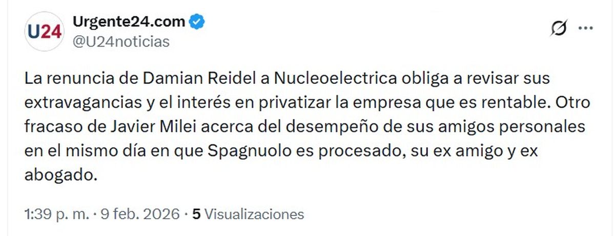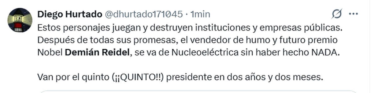 Demian Reidel renunció a la presidencia de Nucleoeléctrica S.A. -empresa estatal que controla las centrales nucleares- en medio de denuncias por sobreprecios.