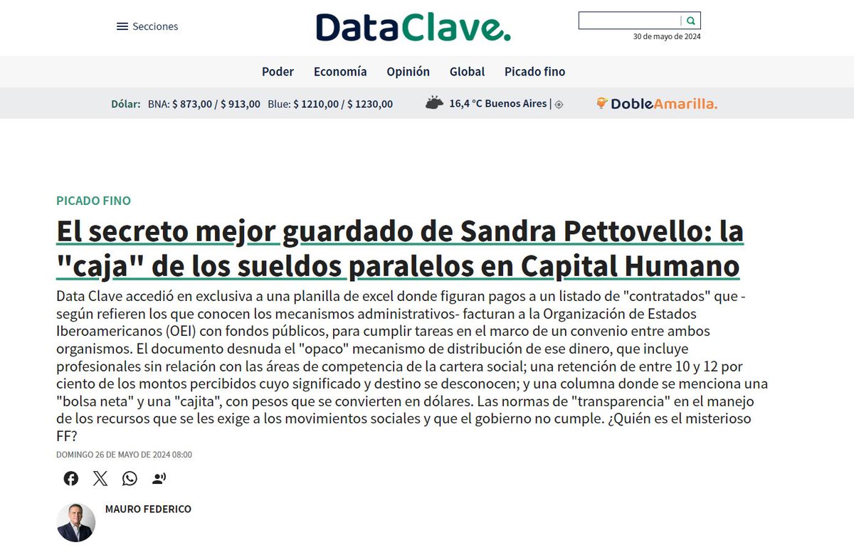 Por su parte, el portal Data Clave publicó el fin de semana una lista de contratados a través de la OEI, pero -afirma- "ninguna de estas personas figura en las bases de datos oficiales del ministerio, ni frecuentan las instalaciones de la dependencia oficial". Habla además de "sueldos paralelos" e incluso de "sobresueldos" en el ministerio de Capital Humano.