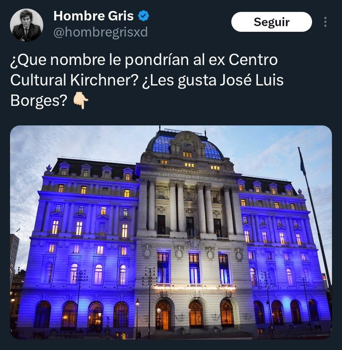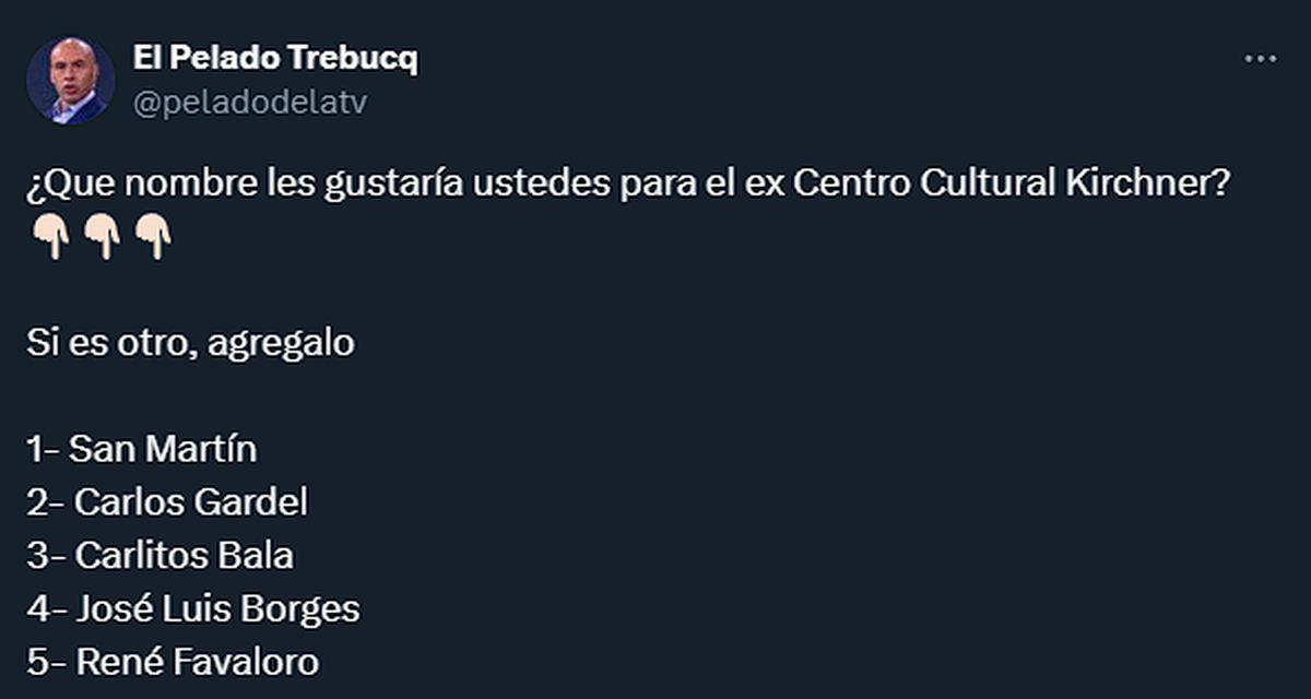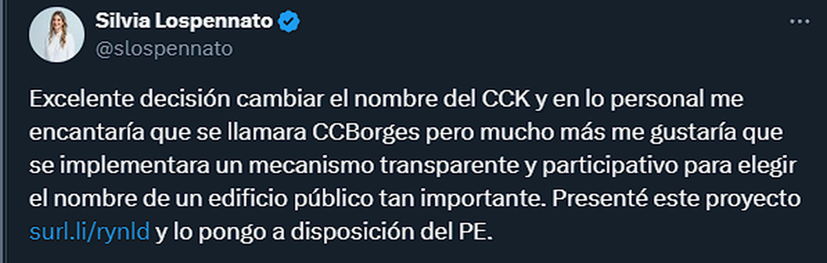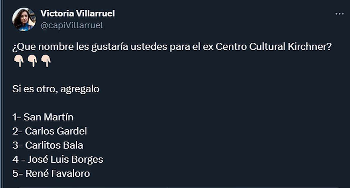 No mucho después, algunos usuarios libertarios, del palo del Gobierno de Javier Milei, postearon alternativas como nuevo nombre del centro. Lo curioso es que dijeron "Jose Luis Borges", imaginamos que en referencia a Jorge Luis Borges, el autor argentino, referencia mundial de literatura y fuente de inspiración constante incluso de la cultura pop.