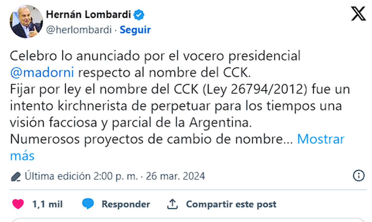Más allá de cualquier consideración o valoración política o ideológica sobre la necesidad de cambiar el nombre del centro cultural en cuestión, hay que destacar que Manuel Adorni incurrió en un grueso error, por ignorancia o falsedad: no es "ya ex CCK", hoy sigue llamándose así, ya que el cambio de nombre deberá pasar por el Congreso.