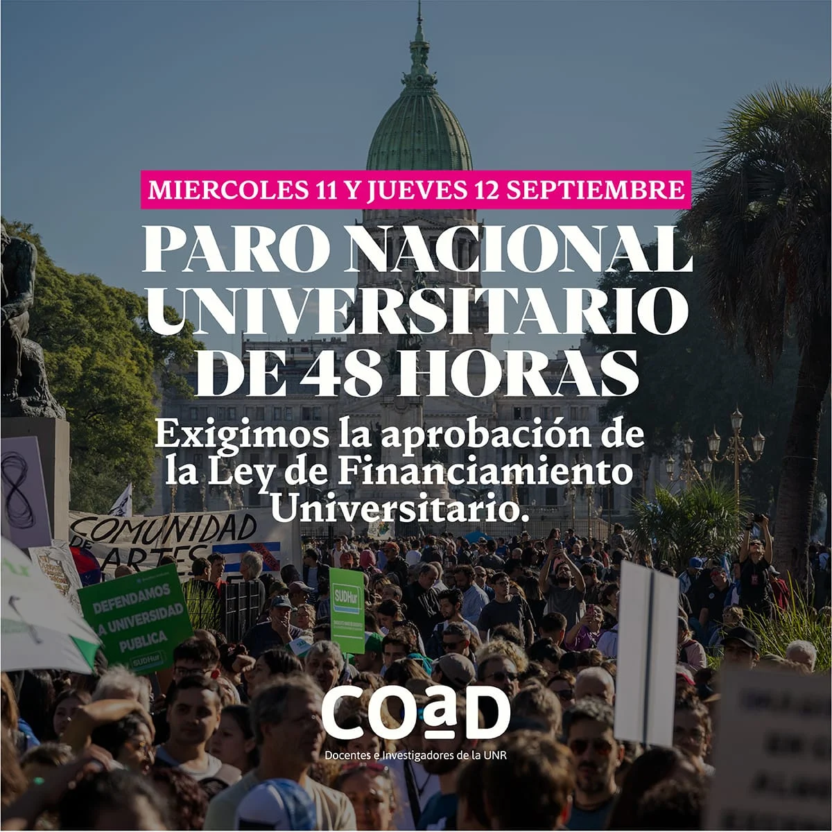 ROSARIO. Una vez más, docentes de la Universidad Nacional de Rosario (UNR) nucleados en el gremio COAD, realizarán un paro de 48 horas este miércoles y jueves. La medida de fuerza se enmarca en el plan de lucha nacional que tiene como demanda la inmediata sanción de la Ley de Financiamiento Universitario.