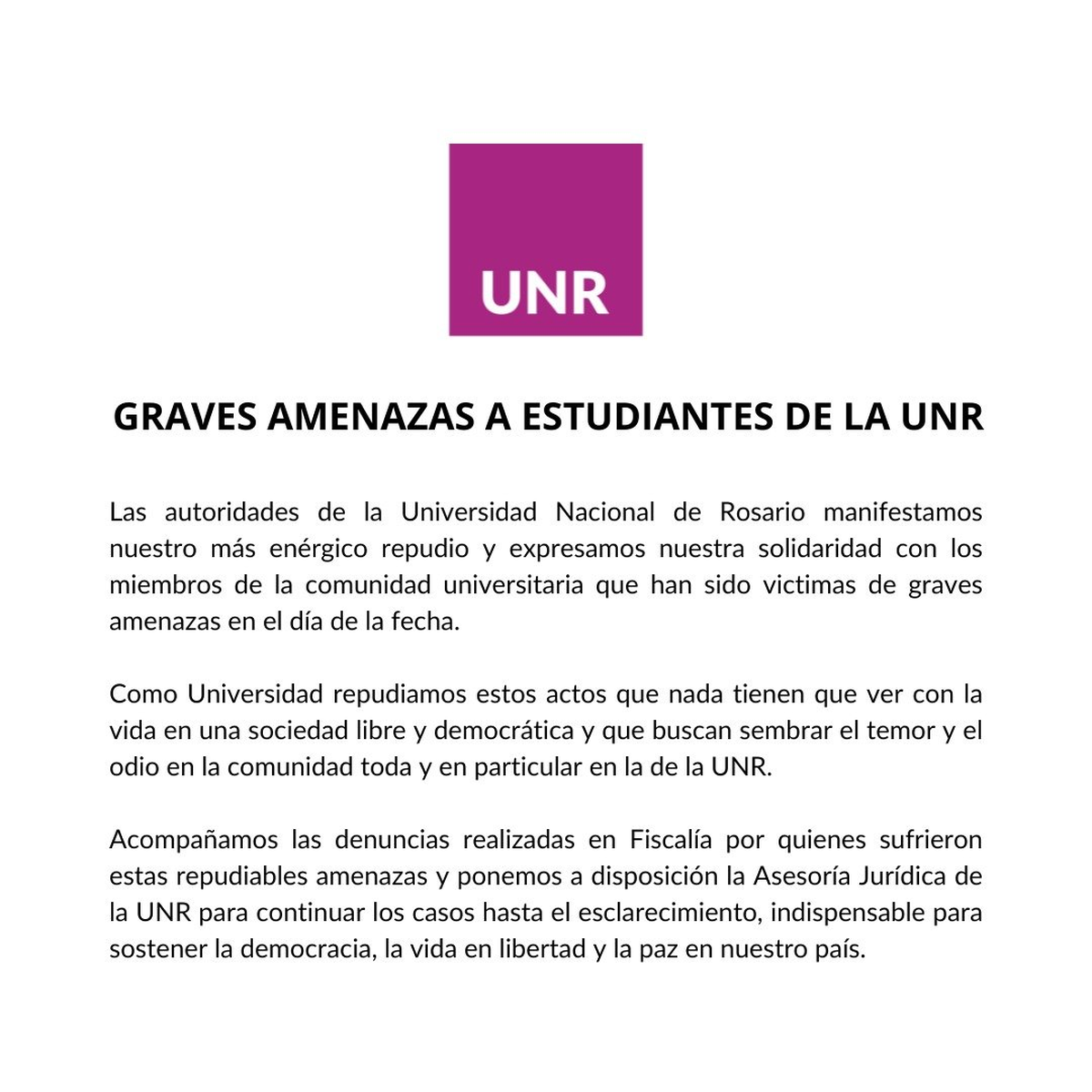 Siguiendo con la línea de Rosario, la UNR realizó un texto despreciando la actitud sobre las autoridades de la misma. "Las autoridades de la Universidad Nacional de Rosario manifestamos nuestro más enérgico repudio y expresamos nuestra solidaridad con los miembros de la comunidad universitaria que han sido victimas de graves amenazas en el día de la fecha".