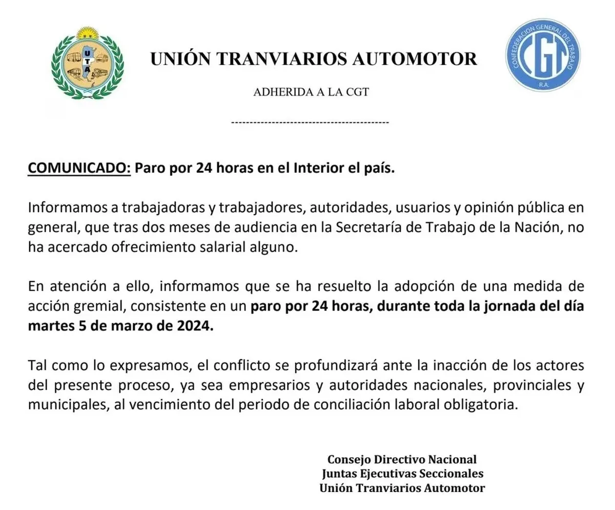 El comunicado lleva las firmas del Consejo Directivo Nacional y las Juntas Ejecutivas Seccionales de la Unión Tranviarios Automotor. Si bien la medida abarca a todos los colectivos del interior, se espera los comunicados de cada seccional del gremio.