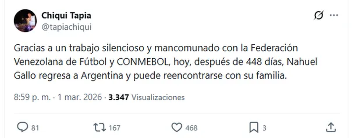 "Por fin podemos decirlo! Nahuel Gallo LIBRE!!! Una gestión que se le debe a la diplomacia parlamentaria argentina no oficialista, ex embajadores y especialmente a la diplomacia deportiva de la AFA. Todo lo que entorpecieron desde Cancillería lo desactivamos desde el sentido común. Esto nos demuestra que todos unidos, distinción partidaria, superamos la inoperancia oficial. Que Dios bendiga a nuestros compatriotas y le dé paz a la familia Gallo de una buena vez".