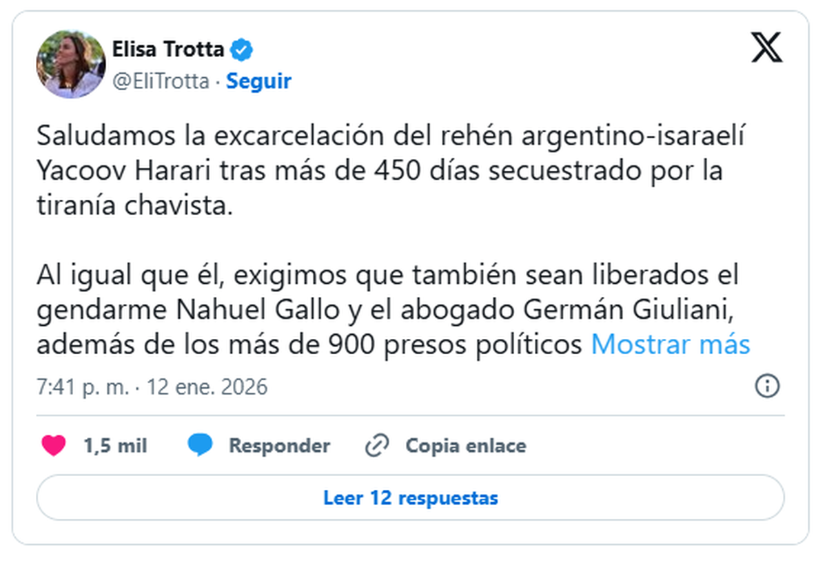 Se demora la liberación del gendarme argentino Nahuel Gallo y de Germán Giuliani. Desde el Congreso de la Nación pidieron la interpelación del canciller Pablo Quirno. En tanto, excarcelaron en Venezuela al ciudadano argentino-israelí de 72 años Yaacob Harary.