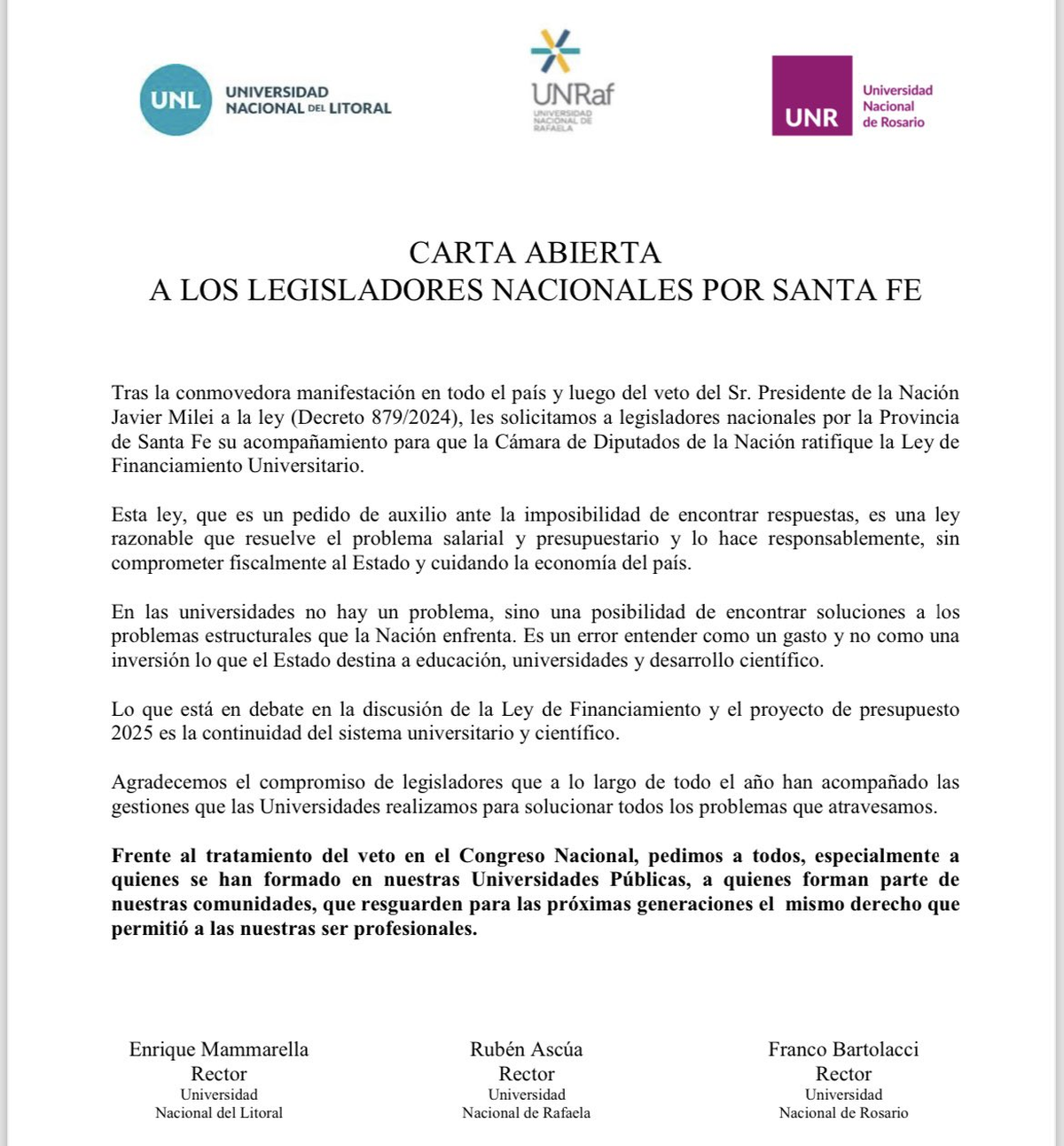SANTA FE. En la antesala a la sesión de Diputados, donde se definirá si queda firme el veto o se ratifica la Ley de Financiamiento Universitario, los rectores de las tres universidades nacionales de la provincia hicieron pública una carta abierta a los legisladores que representan el suelo santafesino.