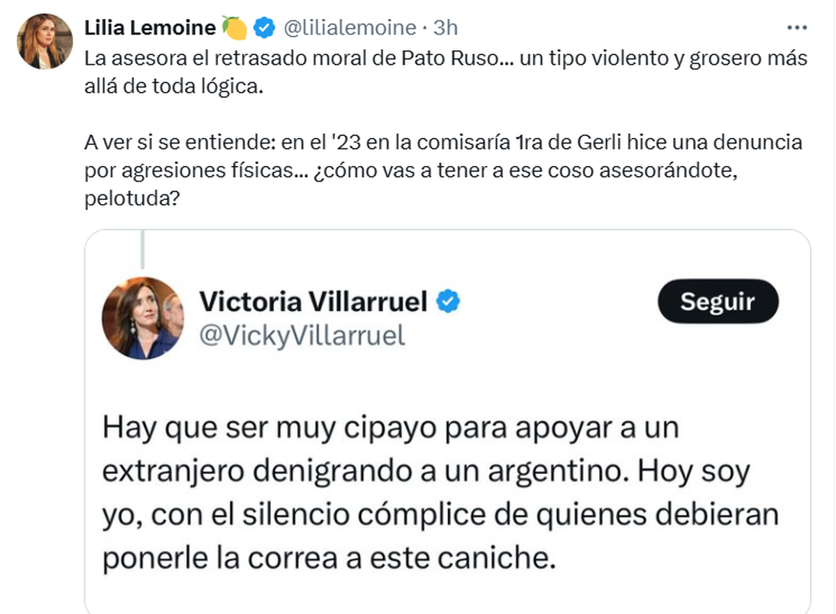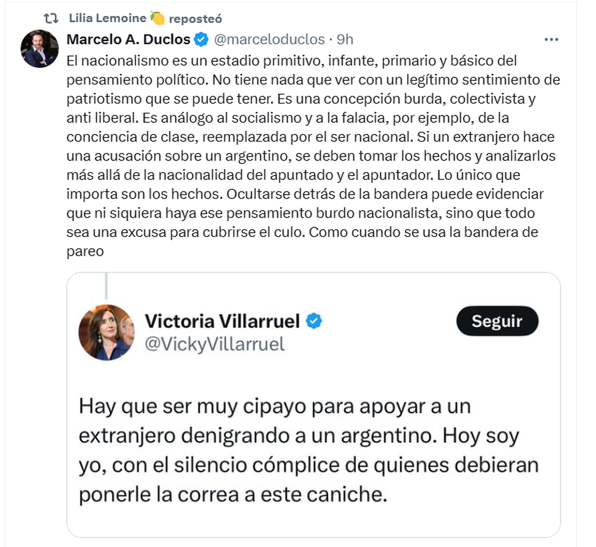 La crítica fue directa para Javier Negre, quien publicó un video "explicando" (justificando) por qué Javier Milei le negó el saludo en el Tedeum, pero también un tiro por elevación a los libertarios que compartieron dicho video. Lilia Lemoine, hace tiempo enfrentada públicamente con Villarruel, fue una. Otro fue Santiago Oría, el realizador audiovisual del Presidente.