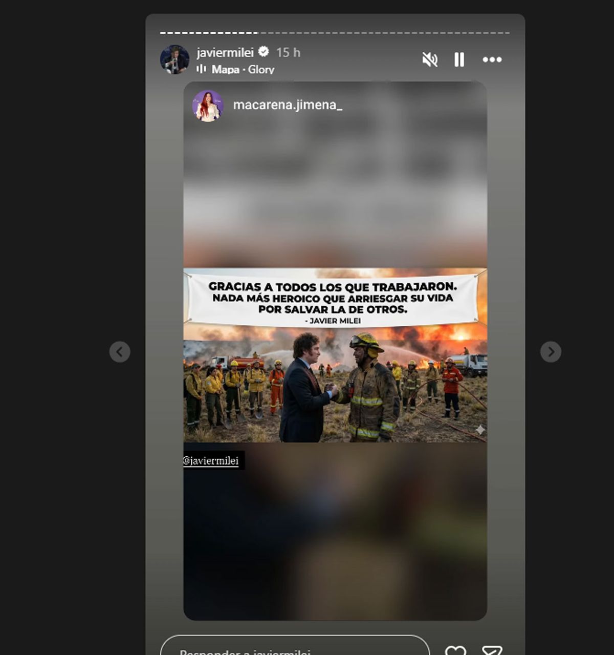 Se refieren a una imagen el propio Milei publicó en su cuenta de Instagram en la que se lo ve en la zona del incendio estrechando manos con un bombero.