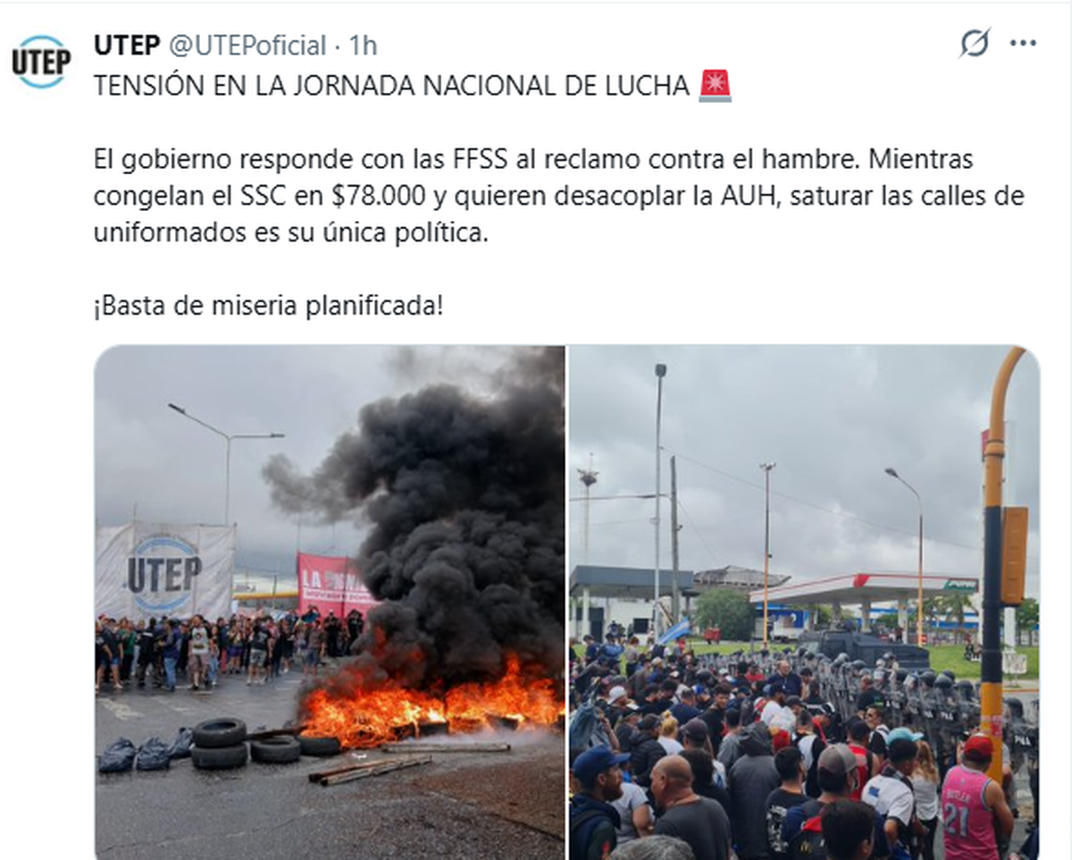 Desde la UTEP informaron en sus redes sociales sobre la presencia de fuerzas de seguridad para desalojar los piquetes.