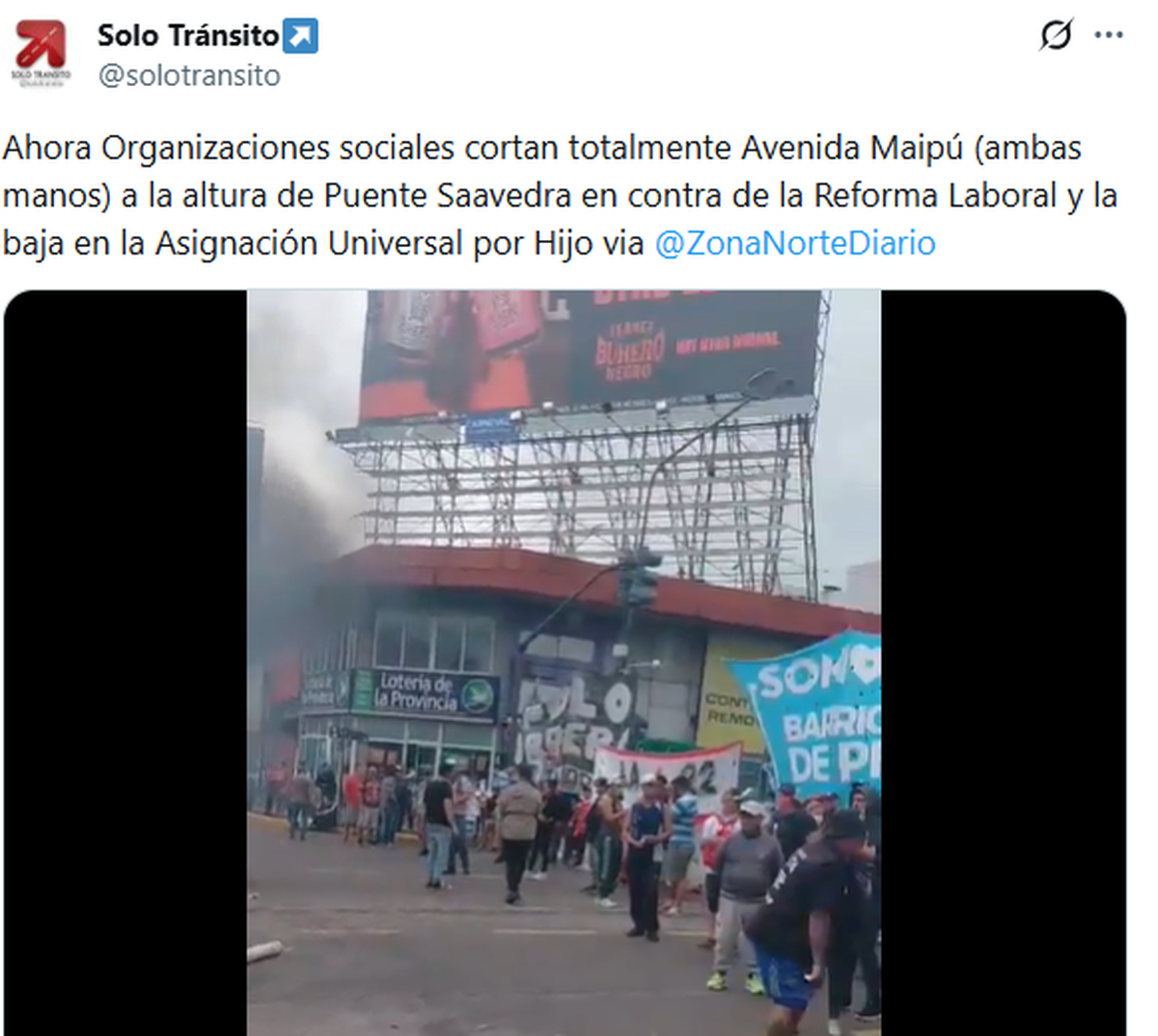 “Comenzaron los cortes simultáneos en todo el país desde Río Grande a Jujuy y desde Córdoba a Buenos Aires Capital en la Matanza en ruta 3 en Liniers en Saavedra en el puente La Noria en el puente Pueyrredón y en la bajada autopista la plata NO A LA REFORMA LABORAL EXCLAVISTA”, escribió en su cuenta personal de X, Eduardo Belliboni dirigente del Polo Obrero.