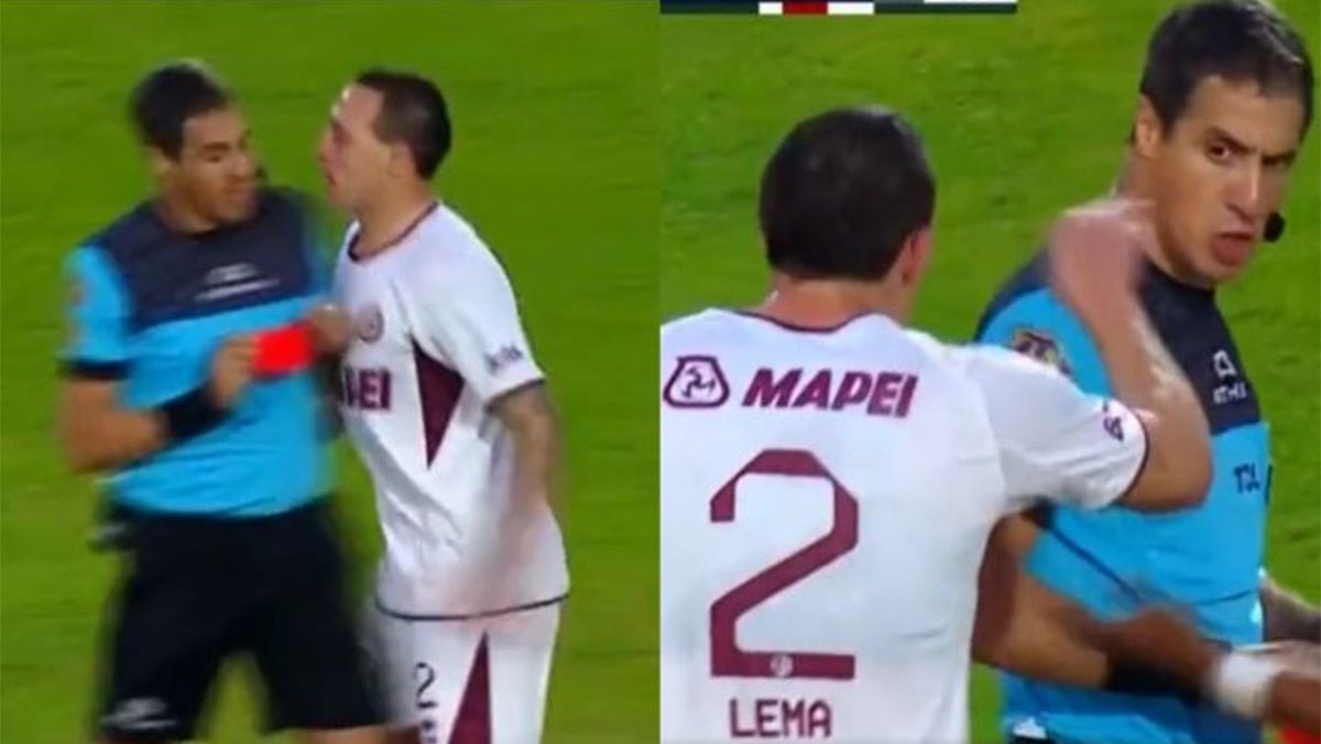 Una vez que vio la roja, el zaguero de Lanús tuvo un rapto de furia. Lema empujó con el pecho al juez y le propinó una catarata de insultos a Echavarría.
