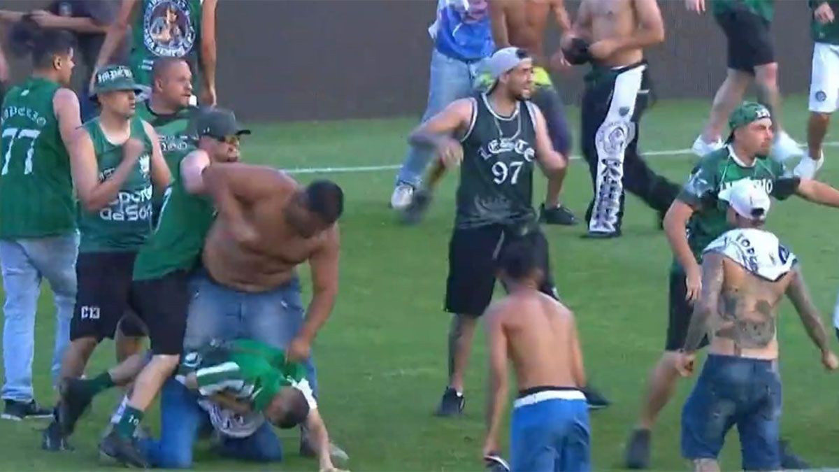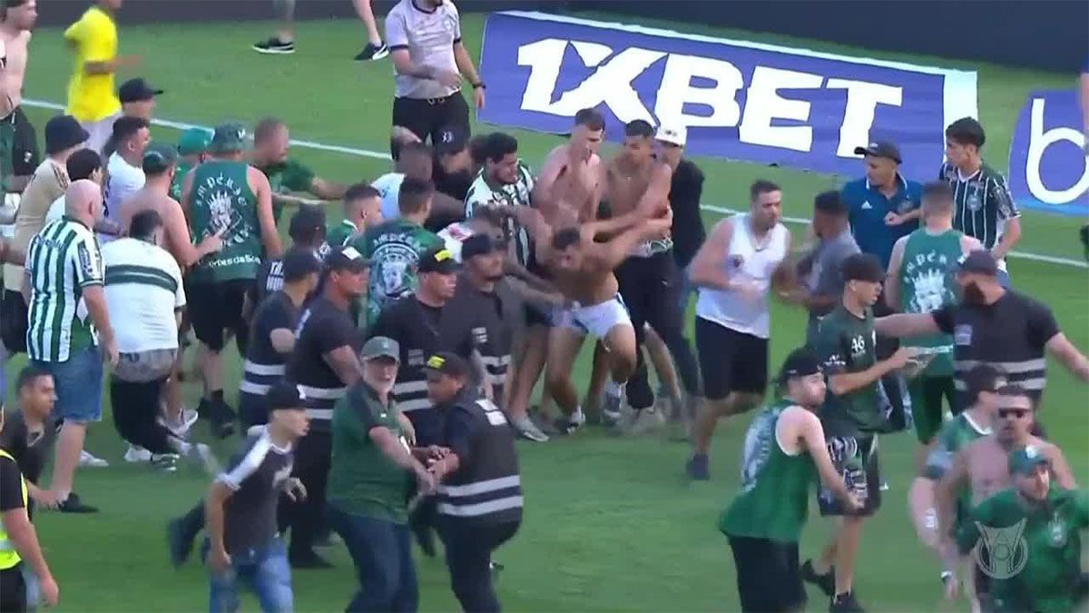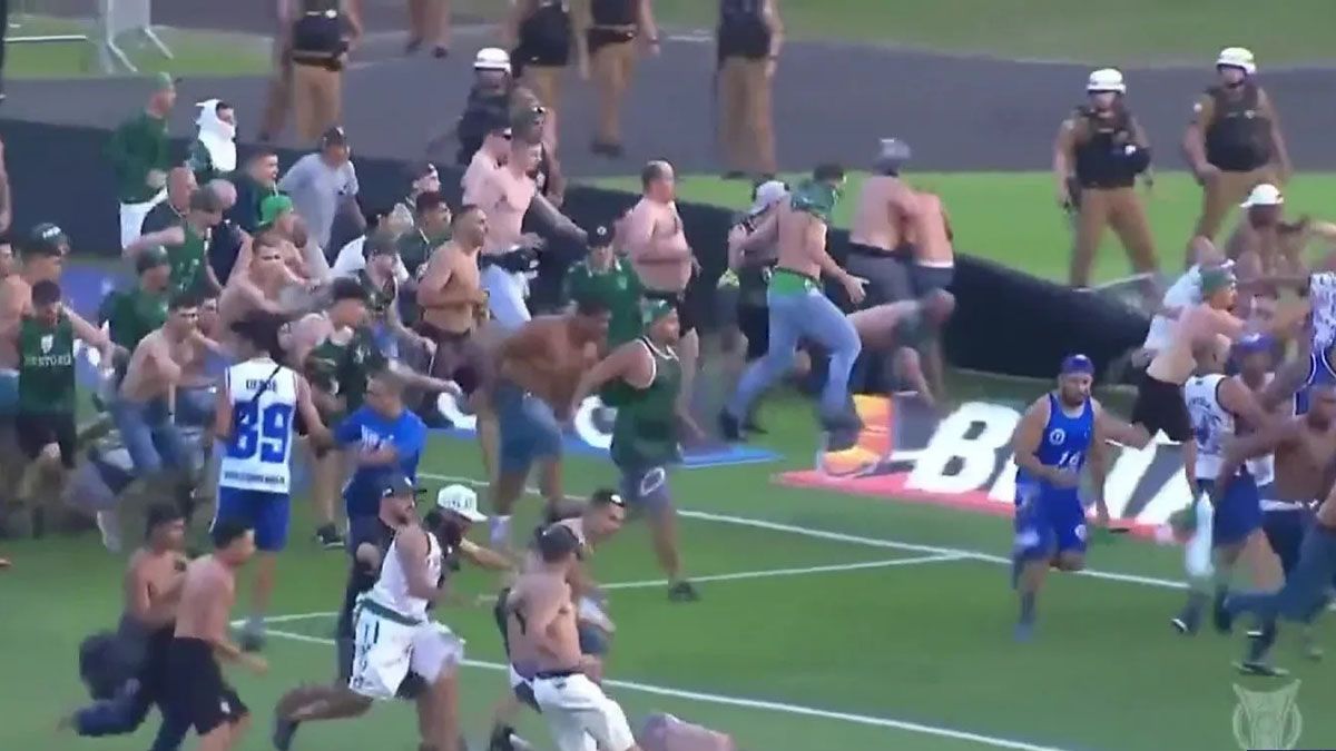 Inmediatamente, los hinchas de Coritiba replicaron la conducta y también saltaron al terreno de juego, dando inicio así a una pelea incontrolable que pudo llegar a su fin tras la intervención policial.